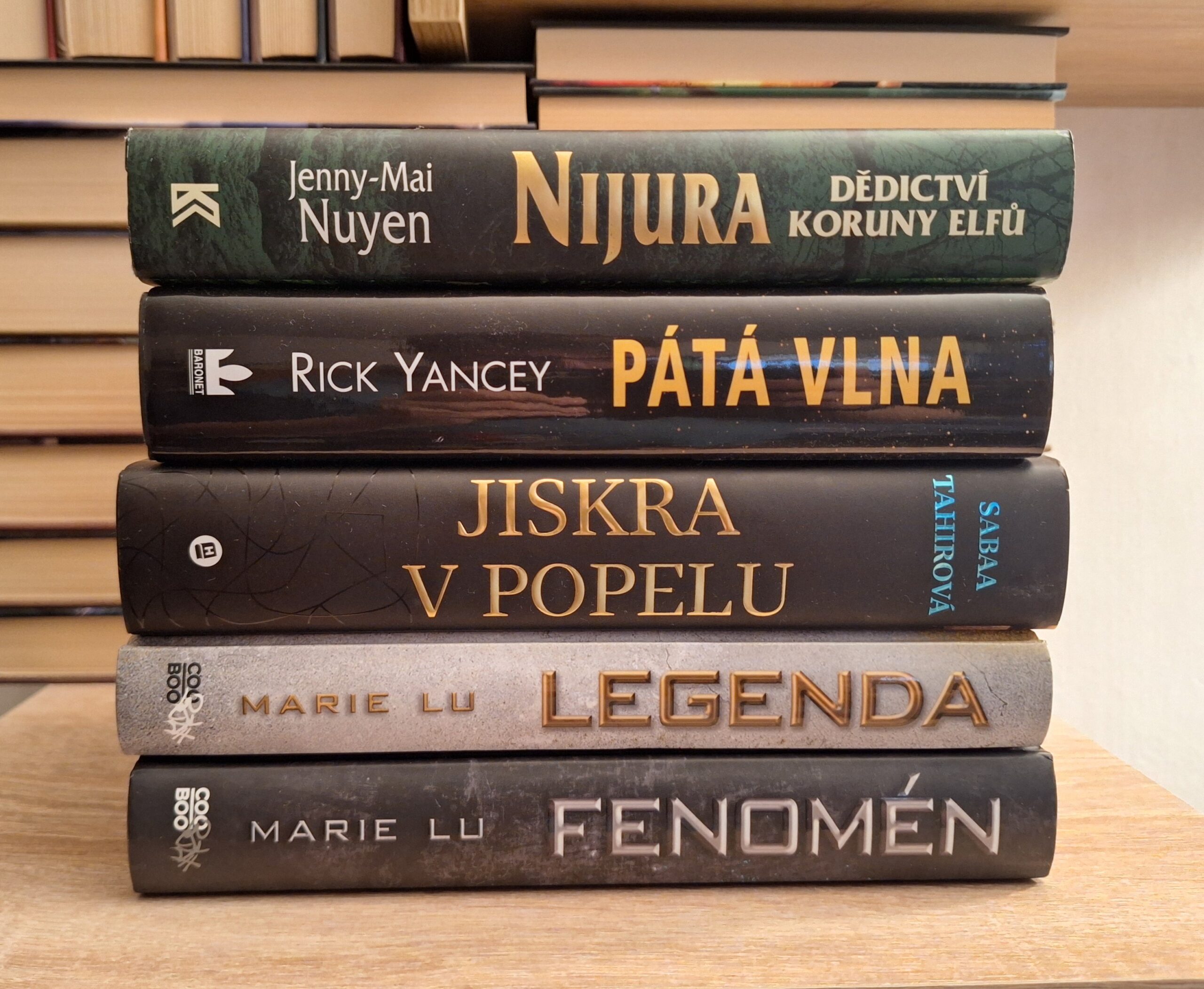 A třetí hromádka obsahuje takový mix všeho možného. Nijura – dědictví koruny elfů od Jenny-Mai Nuyen, Pátá vlna Ricka Yanceyho, Jiskra v popelu od Sabay Tahir a nebo dystopická dilogie Legenda a Fenomén od Marie Lu.