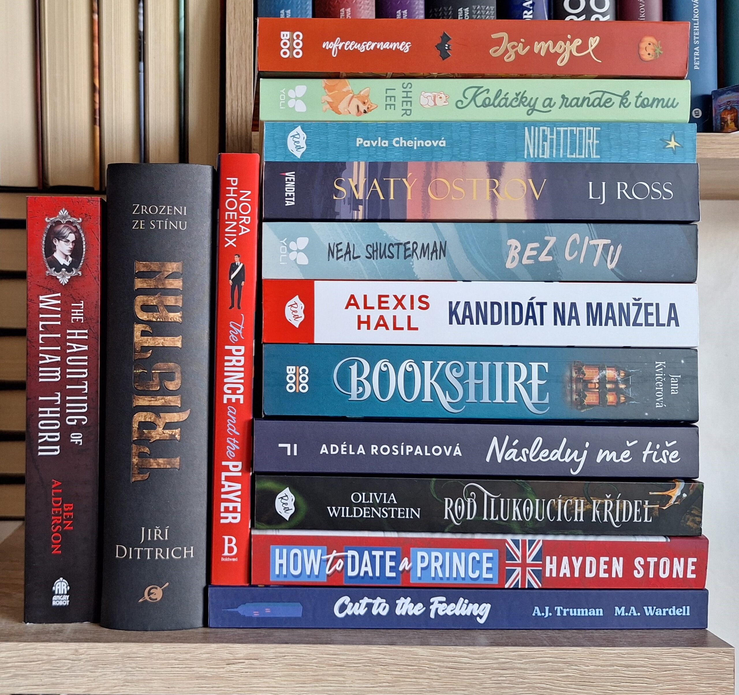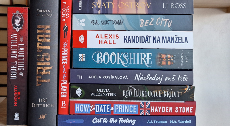 Pak tu máme pár krátkodobých předobjednávek, především z eshopu Albatrosmedia.cz. Jedná se o knihy Bookshire (Jana Kvičerová), Následuj mě tiše (Adéla Rosípalová) a Jsi moje <3 (nofreeusernames). Na eshopu nejlevnejsi-knihy.cz jsem si objednal dvě nové anglické royal MM romance How to Date a Prince (Hayden Stone) a The Prince and the Player (Nora Phoenix) a u Dobrovského jsem si předobjednal pokračování knihy Kandidát na přítele, tentokrát s názvem Kandidát na manžela (Alexis Hall) a také jednu novinku od nakladatelství YOLI – Koláčky a rande k tomu (Sher Lee). Ve výprodejové akci v Luxoru jsem koupil Bez citu od Neala Shustermana pro doplnění jeho série Bez šance a na již zmiňovaném Festivalu knižních závisláků v Plzni jsme v pátek na warm-upu dostali jako dárek reading copy knihy Rod tlukoucích křídel od Olivie Wildenstein a všichni návštěvníci sobotního festivalu dostali novinku Svatý ostrov od L.J. Ross. V tašce s výhrou v pátečním kvízu na warm-upu jsem našel českou MM romanci Nightcore od Pavly Chejnové, po které jsem už chvíli pokukoval v chystaných novinkách, takže mi to výhra usnadnila.