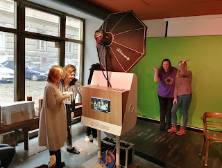 Pak už jsme si pochutnávali na dortech a dalších dobrotách, bavili se spolu a také jsme se fotili ve fotokoutku od Tvoj Party Box. Před zelenou plochou jsme se mohli vyfotit s různými naklíčovanými pozadími, některé z nich můžete vidět i na mých fotkách, kde jsem s Míšou, Erikou a Lukášem, se kterými už trávíme YOLI narozeniny poněkolikáté (tuším, že počtvrté). Letos se k nám ještě připojil Aleš Novotný. Na jedné fotce můžete vidět i Kláru Novákovou alias Klářiny knihy.